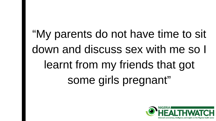 Editor’s Note: Nigeria Health Watch in collaboration with Education As A Vaccine (EVA) recently conducted two Focus Group Discussions (FGDs) in Nyanya and Kuje areas of the Federal Capital Territory, amongst adolescent. The objectives of the FGD was to gauge the perceptions of adolescents about sexual and reproductive health, identify the key issues they face in accessing sexual and reproductive health services in Nigeria, and make recommendations for sexual and reproductive health and rights (SRHR) for adolescents. Nigeria Health Watch Team members, Chibuike Alagboso and Atinuke Akande share key findings from the FGD.