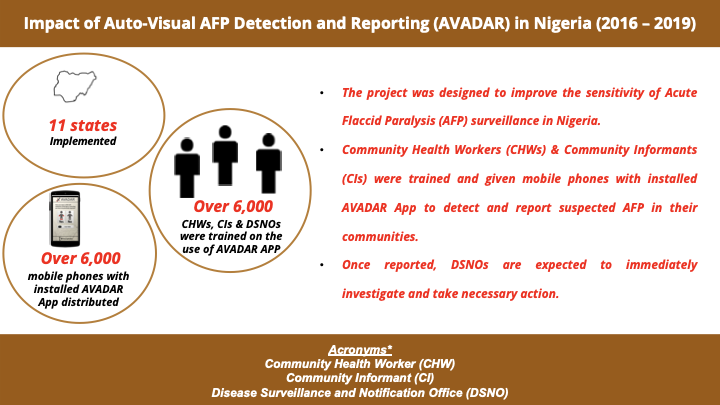 Like any other technology, the AVADAR system has its limitations, including the cost of purchasing over 8,000 mobile phones, payment of monthly airtime recharge to all the users for sending reports via SMS and intermittent network connection hindering reporting across some LGAs. However, the AVADAR system has contributed immensely to the eradication of polio through the improvement of active surveillance.