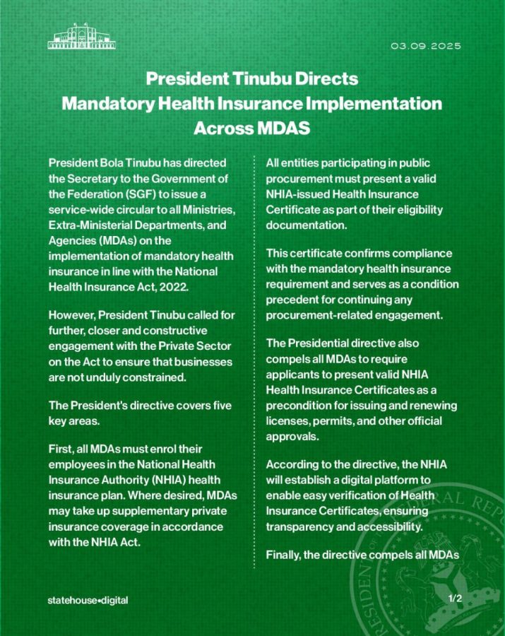 President Bola Ahmed Tinubu’s directive mandating all Ministries, Departments, and Agencies (MDAs) to enrol their employees under the National Health Insurance Authority (NHIA) marks a significant policy inflection point in Nigeria’s universal health coverage (UHC) journey. It moves health insurance from the realm of voluntary uptake into the domain of regulatory compliance.
