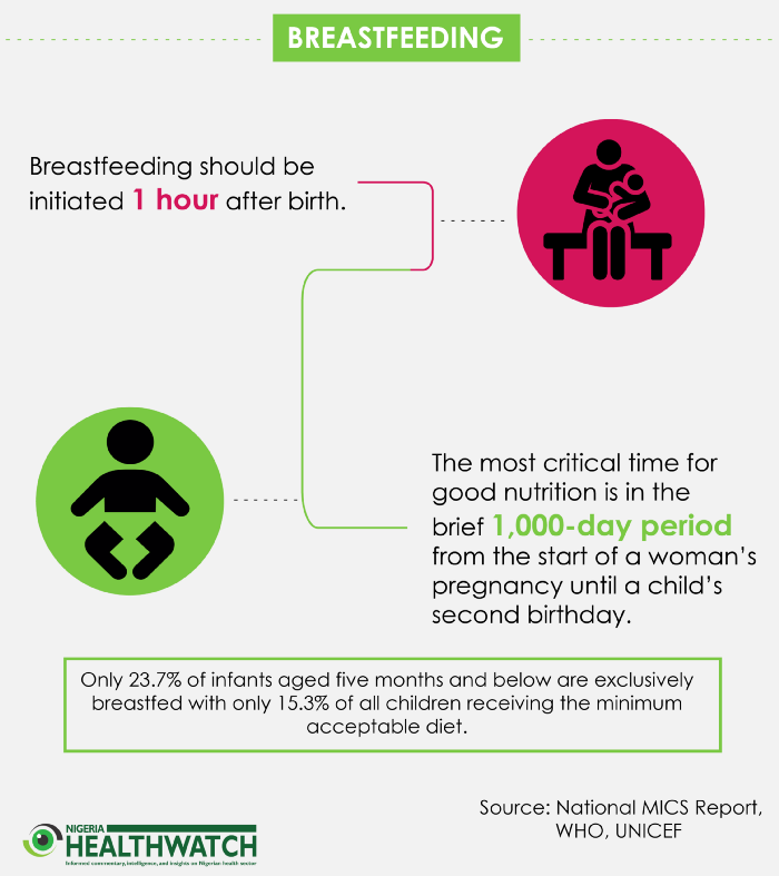 Nigeria’s low EBF rates may likely be attributed to a combination of traditional and socio-cultural misconceptions about breastfeeding, ignorance about its importance, non-conducive work environments for breastfeeding, deceptive marketing of breast milk substitutes to health workers, and lack of awareness-creation on the part of health workers at the primary health care level. The World Health Organization (WHO) and United Nations Children’s Fund (UNICEF) both recommend that breastfeeding should be initiated within the first hour after birth, as the most critical time for good nutrition is in the 1,000-day period from the start of a woman’s pregnancy, until a child’s second birthday.