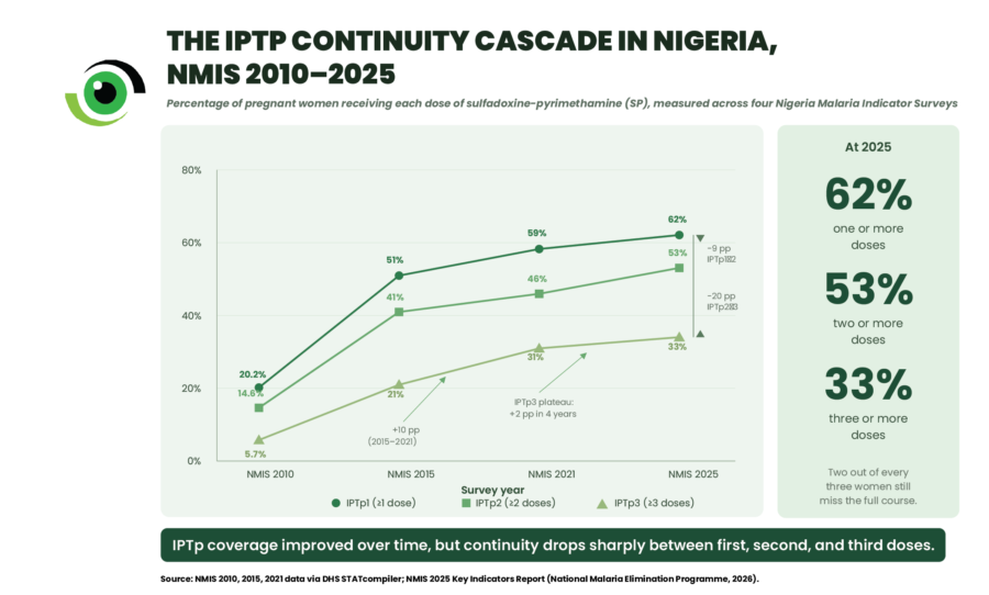 Available data consistently emphasise where the continuity of malaria interventions breaks down. In 2015, 51% of pregnant women in Nigeria received at least one dose of intermittent preventive treatment with sulfadoxine-pyrimethamine (IPTp‑SP); however, only 41% received a second dose, and just 21% received three or more doses, which the World Health Organization recommends for effective protection. Between the first and third contacts, coverage declined by 30 percentage points, revealing a gap in continuity that cannot be ignored.
