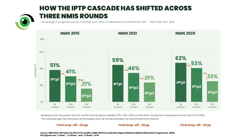 By 2021, the third-dose figure had risen to 31%, marking the most significant single improvement in over a decade of survey data, and indicating that community-based delivery and strengthened coordination through the national Malaria in Pregnancy Technical Working Group are beginning to make an impact.
