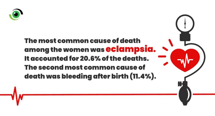 The most common cause of death among the women was eclampsia. It accounted for 20.6% of the deaths. Eclampsia is characterised by convulsions in pregnant women which are a result of high blood pressure. The second most common cause of death was bleeding after birth (11.4%).