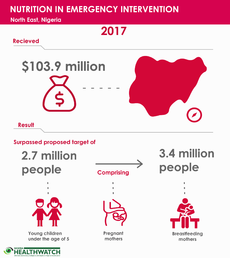 The Nutrition in Emergency, Northeast, Nigeria intervention in 2017 received a total funding of US $103.9 million and surpassed the proposed target of 2.7million people by reaching over 3.4 million people comprising young children (male and female) under the age of five, pregnant and lactating mothers. However, the intervention’s performance indicator for its out-patient therapeutic program (OTP) had a 10% default rate, which means that 30,707 people dropped out of the program.