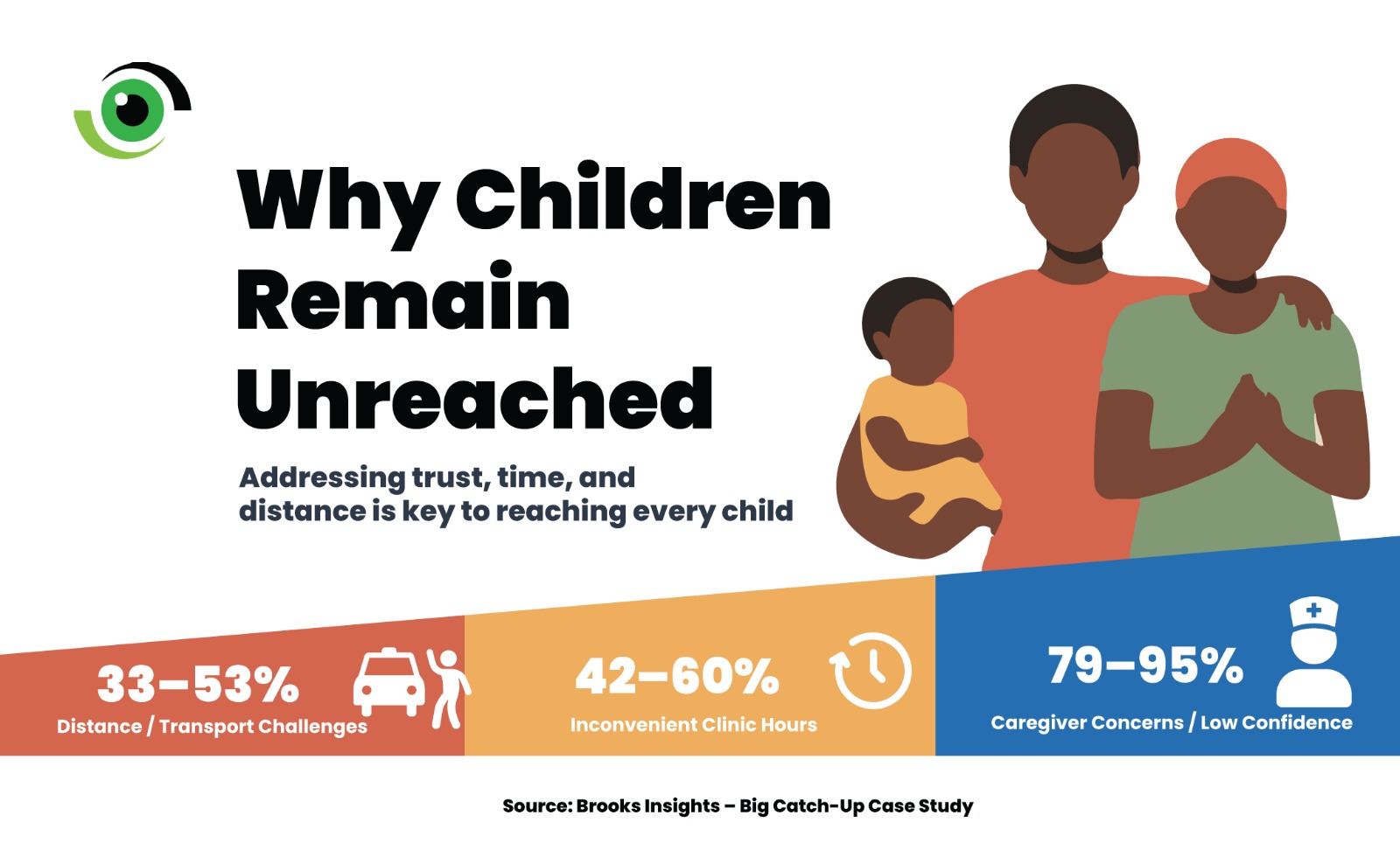 A mixed delivery model, fixed sessions, outreach, and mobile teams helped reach different groups of missed children. Adjusted clinic schedules and early-morning outreach during farming seasons improved access, while phone reminders and community dialogues helped address low salience, competing priorities, and missed appointments.